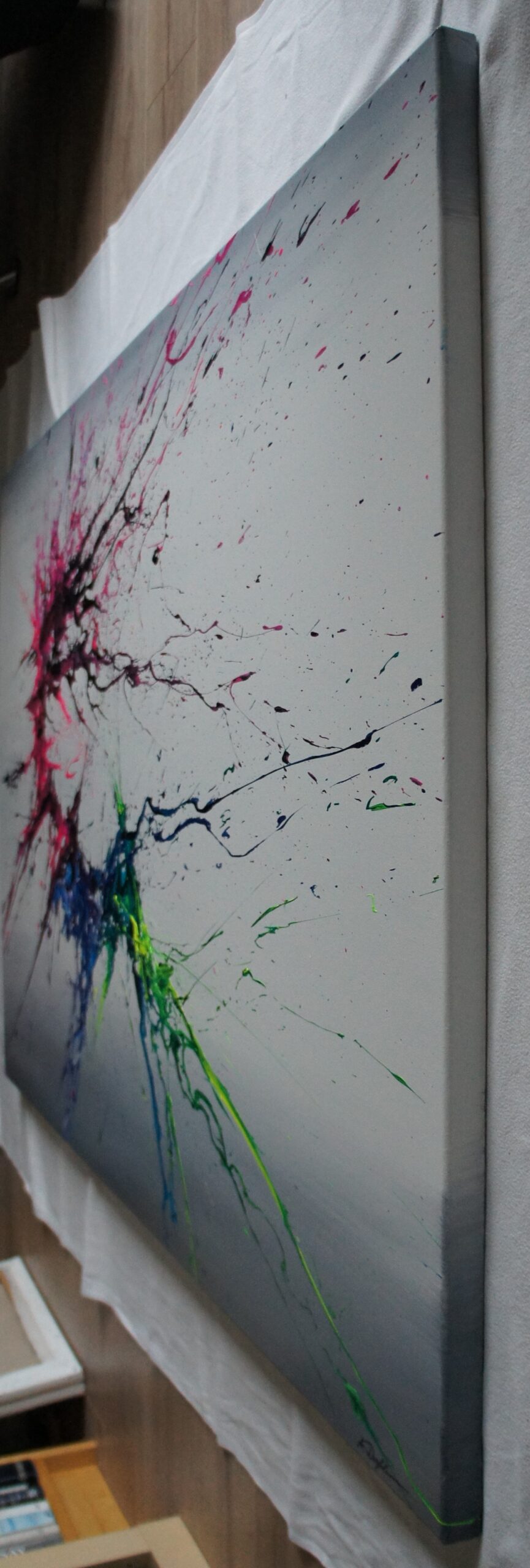 Sides are painted, thus no frame necessary – the painting is ready-to-hang with a hanging wire attached.