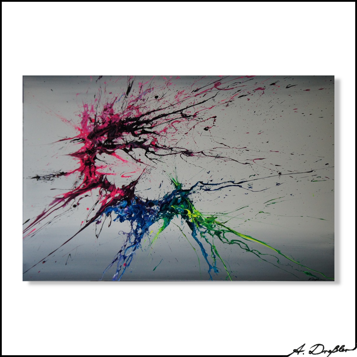 Unique painting with a signatory style that is unique in the art world, using high-quality acrylic colors on professional gallery canvas stretched over solid wooden 4.5 x 3.0 cm stretcher bars (painting depth: 3 cm); canvas is stapled on the back.